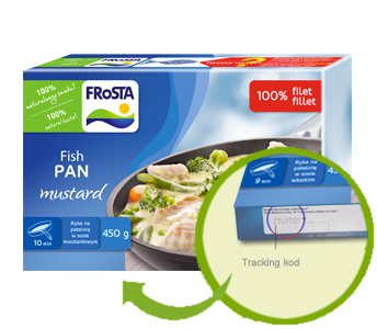 FISH TRACKING kod składa się z ciągu 10 cyfr i liter. Znajduje się w polu kodowym opakowania bezpośrednio pod datą ważności.