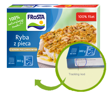 FISH TRACKING kod składa się z ciągu 10 cyfr i liter. Znajduje się w polu kodowym opakowania bezpośrednio pod datą ważności.
