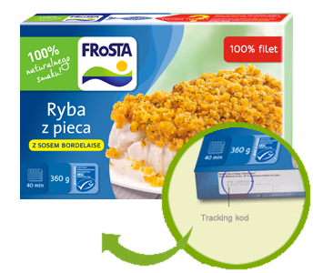 FISH TRACKING kod składa się z ciągu 10 cyfr i liter. Znajduje się w polu kodowym opakowania bezpośrednio pod datą ważności.